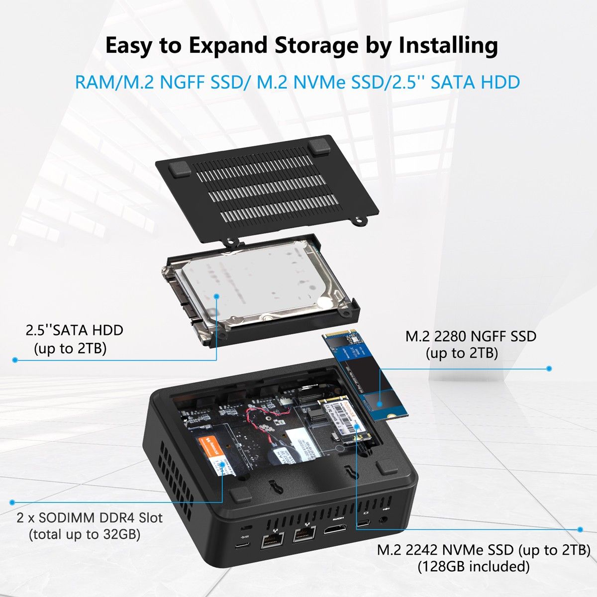 Der Server wird in seiner Grundausstattung mit 8GB RAM und einer 128GB großen NVMe SSD verwendet. Erweitert wurde der Server mit einer 2.5" SSD Samsung 870 QVO 4TB, die genügend Speicherplatz für die geplanten Projekte bieten sollte.